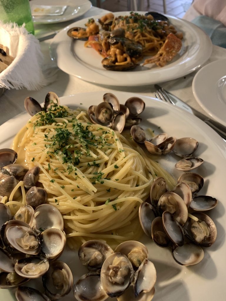 ホテルに到着。リゾートホテルでここに5泊します。荷物を置いて早速ご飯を食べる。リゾートエリアなので観光チックなレストランが多いけど、それでもここはイタリア。平均レベルというか最低限のレベルが保証されているので、ビーチ面したレストランでシーフードパスタ、ボンゴレパスタを食べる。