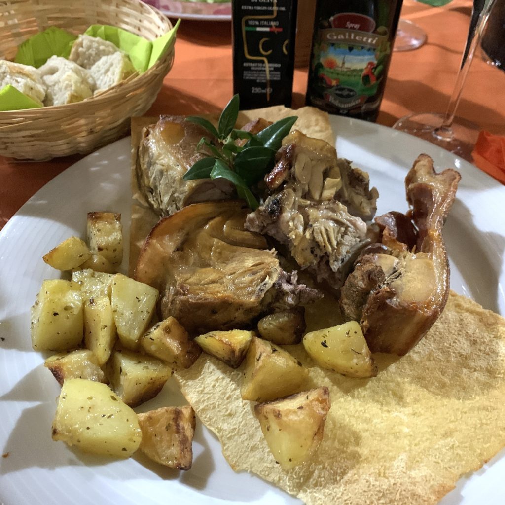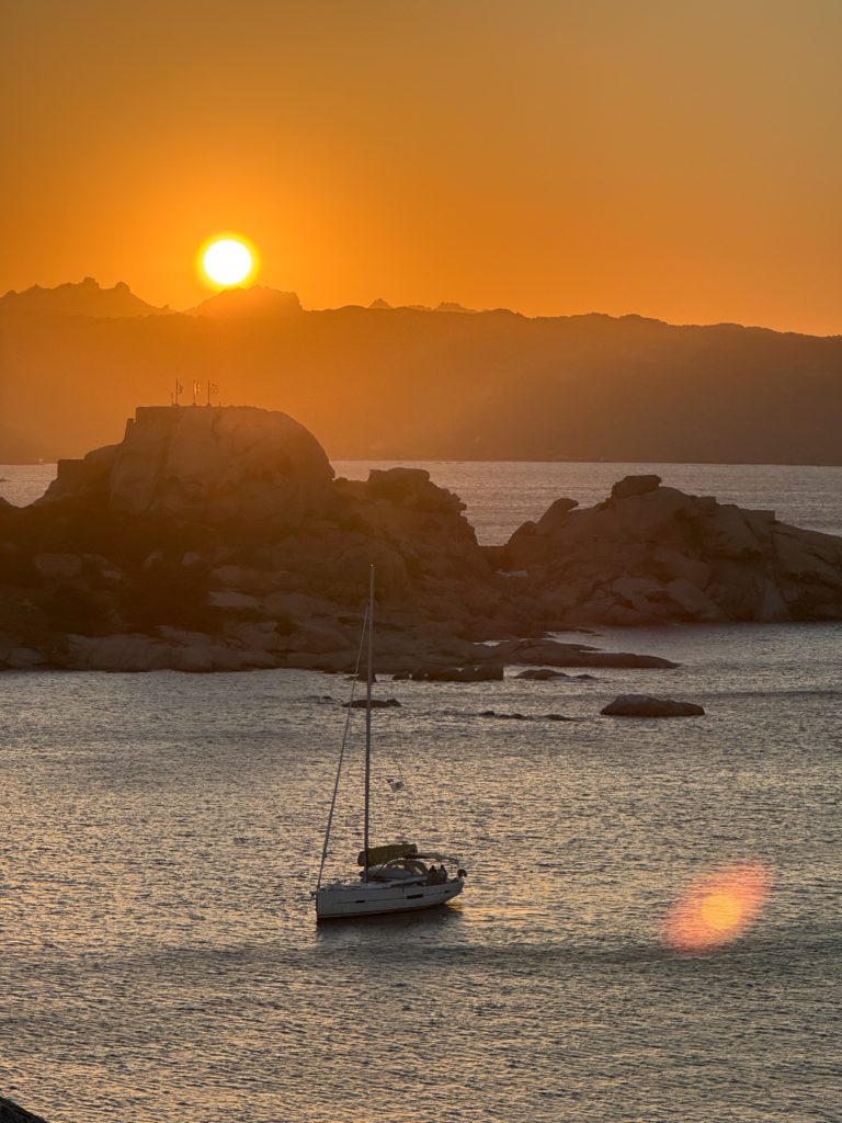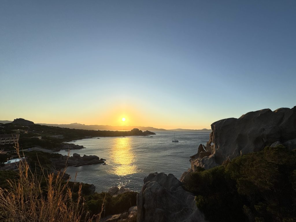 夕陽を眺めて夕食。本日の魚のグリルと、ポルチェットという豚の丸焼き料理、食後にミルトのお酒。ミルトというのはサルデーニャに自生するベリーの種類。その辺にたくさん植っていて、このレストランの前にもミルトの木があって、店員さんがさっき詰んでいました。材料費タダじゃん笑。