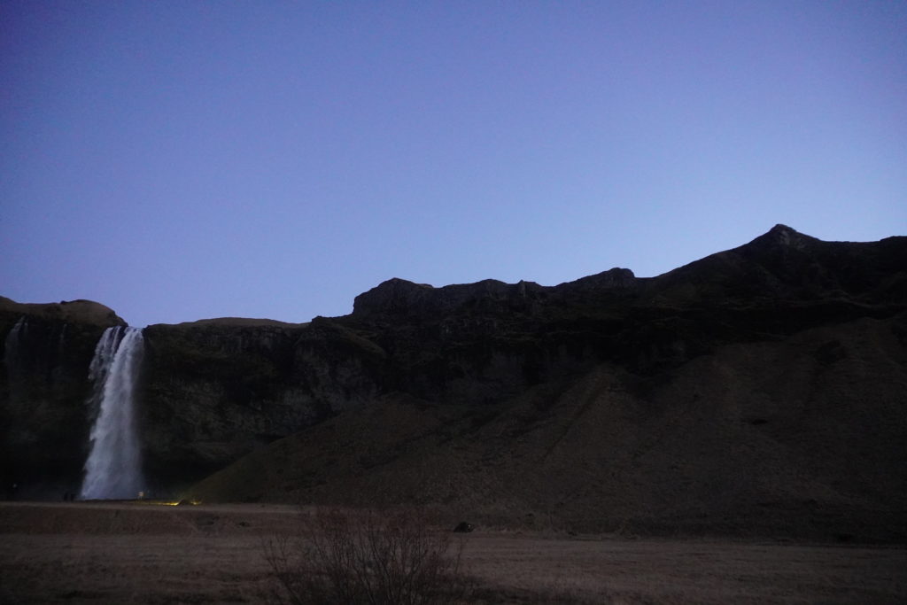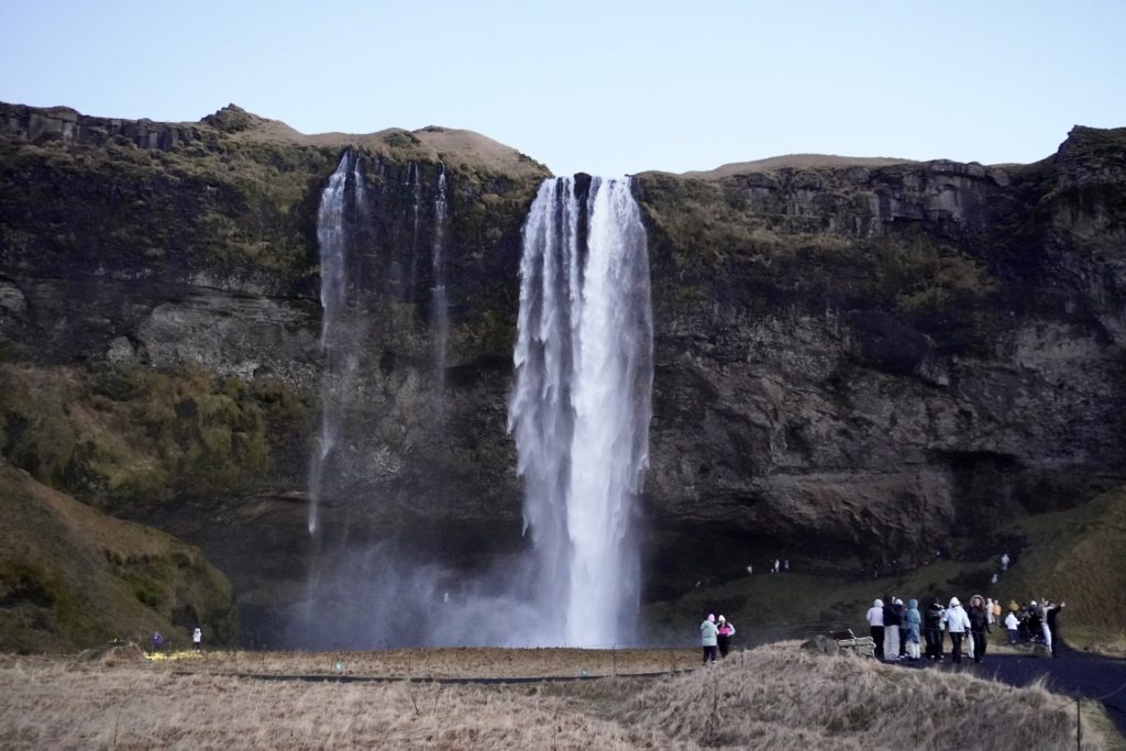 セリャラントスフォスの滝。夏は滝の裏側を歩けるけど冬は凍結で歩けないとシギーが言っていたけど、到着してみるとどうやら裏側も回れそう。うむ温暖化のおかげと言えましょう。